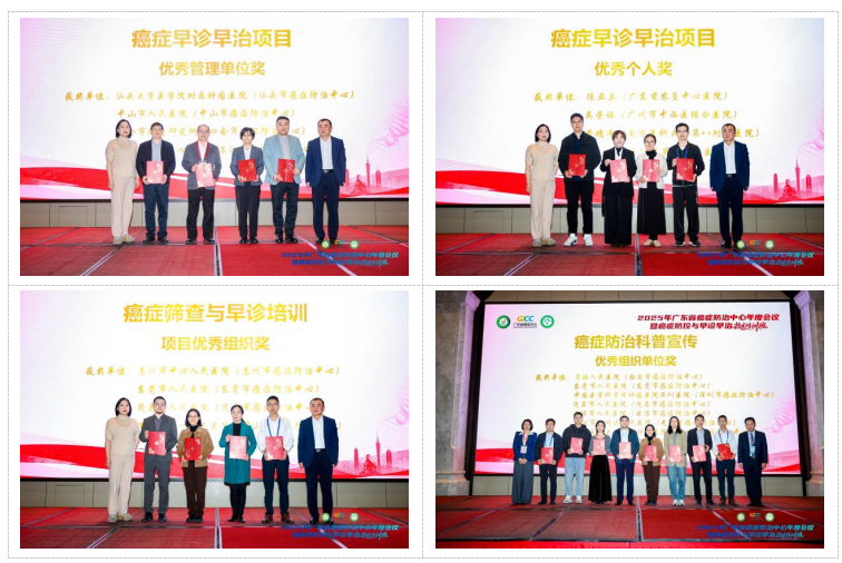 随后,广东省卫健委医疗应急处陈佳吟调研员,中山大学肿瘤防治中心武少新书记、韦玮院长助理及省癌症中心曹素梅教授对2025年我省癌症早诊早治项目、筛查与早诊技术培训项目及癌症防治科普工作中表现突出的16个先进单位和4个先进个人进行颁奖以示表彰。