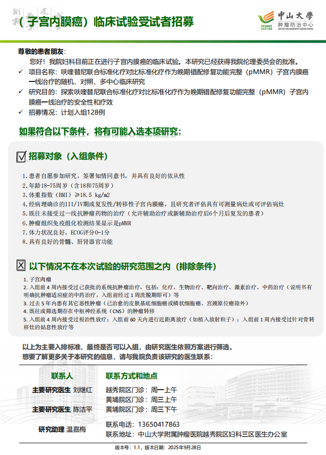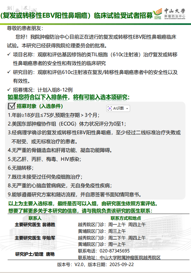 中山大学附属肿瘤医院近期临床试验受试者招募公告(2025年11月发布)