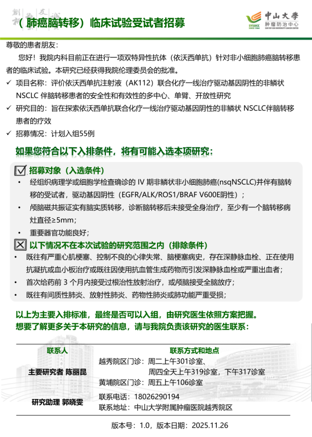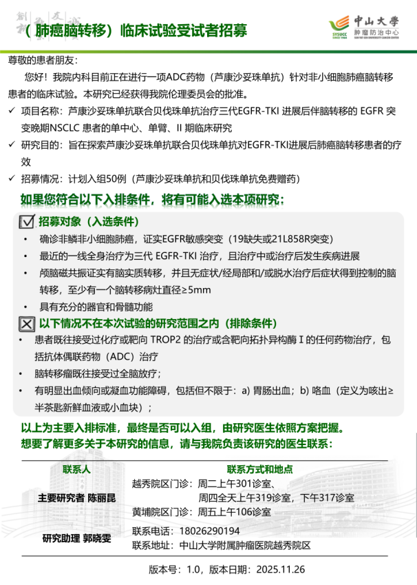 中山大学附属肿瘤医院近期临床试验受试者招募公告(2025年12月发布)