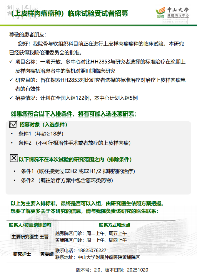 一项开放、多中心对比HH2853与研究者选择的标准治疗在晚期上皮样肉瘤初治患者中的随机对照III期临床研究 |