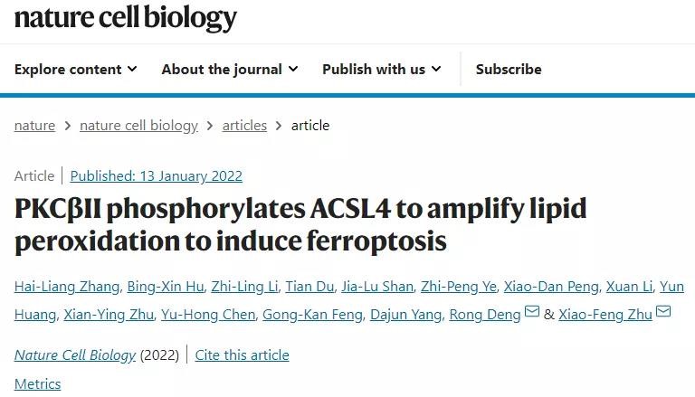 1月13日,国际细胞生物学顶级期刊《自然细胞生物学》(Nature Cell biology)在线发表了中山大学肿瘤防治中心朱孝峰和邓蓉团队的最新成果——“蛋白激酶C-βⅡ亚型通过磷酸化长链脂酰辅酶A合成酶4介导脂质过氧化迅速扩增促进铁死亡”。