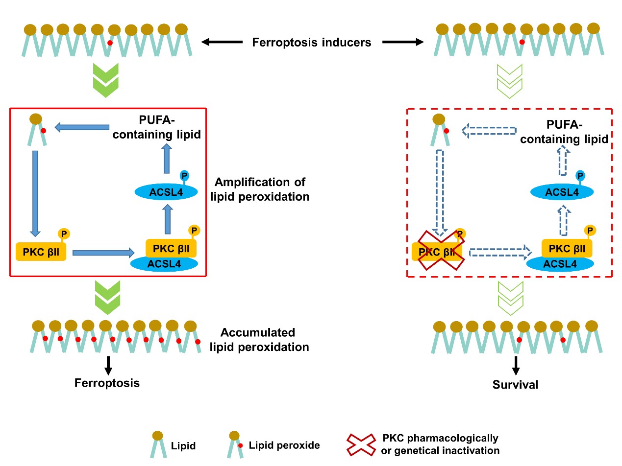 综上所述,本研究发现了铁死亡过程中脂质过氧化感知分子PKCβII;揭示了PKCβII介导脂质过氧化迅速扩增促进铁死亡的分子机制;提示脂质过氧化-PKCβII-ACSL4正反馈通路可为肿瘤等铁死亡相关的疾病治疗提供分子标志物及新靶标。