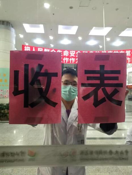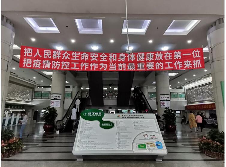 大厅悬挂着鲜红醒目的标语 体现了全体中肿人坚守疫情防控一线的决心和意志!