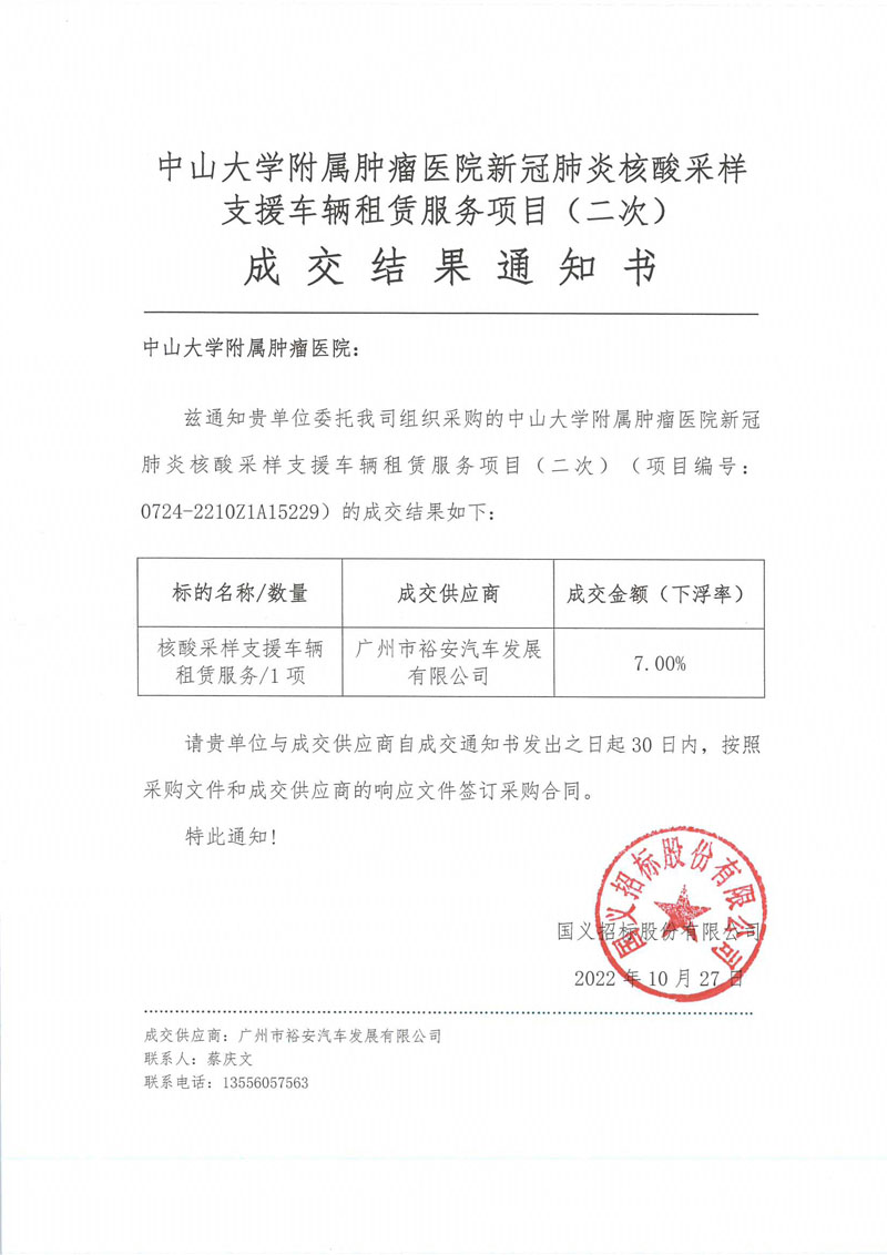 中山大学附属肿瘤医院新冠肺炎核酸采样支援车辆租赁服务项目(二次)成交结果通知书