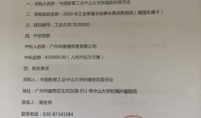 黄埔院区手术麻醉科更衣柜及鞋柜采购项目招标结果公告关于中山大学附属肿瘤医院黄埔院区手术麻醉科更衣柜及鞋柜采购项目(中肿物流[招标(2020)002号])的招标工作已结束,招标结果公告内容如下: 一、项目标的及最高采购限价 二、招标结果 截至递交投标文件截止时间,递交投标文件的投标人不足3家,本项目招标失败。三、采购人的联系方式: 采购人:中山大学附属肿瘤医院 采购人联系人:梁老师 电话:020-87342670 传真:020-87343402 地址:广州市东风东路651号中山大学附属肿瘤医院2号楼负一层物流科被服中心办公室 邮09-162020- 中山大学附属肿瘤医院黄埔院区配套宿舍分体空调采购项目评标结果公告中山大学附属肿瘤医院黄埔院区配套宿舍分体空调采购项目招标,采用综合评分法评标,现就评审结果进行公告如下: 一、项目名称:中山大学附属肿瘤医院黄埔院区配套宿舍分体空调采购项目 二、项目编号:中肿 设备[2020]003 三、成交信息: 包号 项目名称 中标人 数量 单位 中标总价(万元) 1 黄埔院区配套宿舍分体空调 广州嘉又明电器有限公司 1匹空调46台,1.5匹空调99台 台 25.905 此中标公示期为公告期为即日起1个工作日。 各有关当事人对评标结果有异议的,可以在公示期内以书面形09-102020