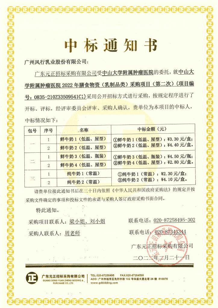 中山大学附属肿瘤医院2022年膳食物资(乳制品类)采购项目(第二次)中标通知书