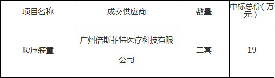 面包屑 首页 / 采购招标 / 采购结果公告 中山大学附属肿瘤医院腹压装置采购项目评标结果公告 2021-02-23 中山大学附属肿瘤医院腹压装置采购项目竞争性谈判,采用最低价法评审,现就评审结果进行公告如下: 一、项目名称:中山大学附属肿瘤医院腹压装置采购项目 二、项目编号:中肿 设备[2021]006 三、成交信息: 此中标公示期为公告期为即日起1个工作日。 各有关当事人对评标结果有异议的,可以在公示期内以书面形式提出异议,逾期将依法不予受理。 中山大学附属肿瘤医院 2021年2月23日 上一篇 下一篇 分享 最新动态