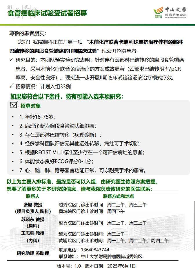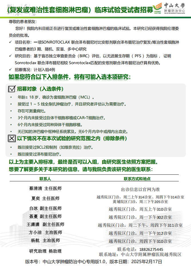 其他更多临床研究项目招募信息,请见https://recruit.sysucc.org.cn/recruit/home#/