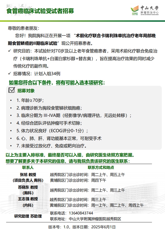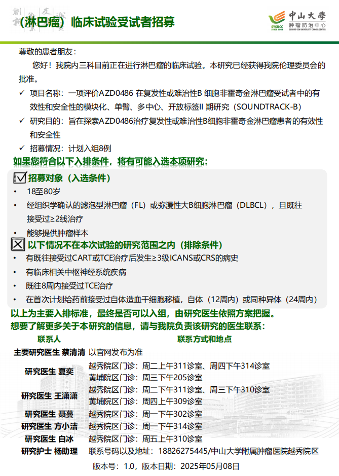 中山大学附属肿瘤医院近期临床试验受试者招募公告(2025年8月发布)
