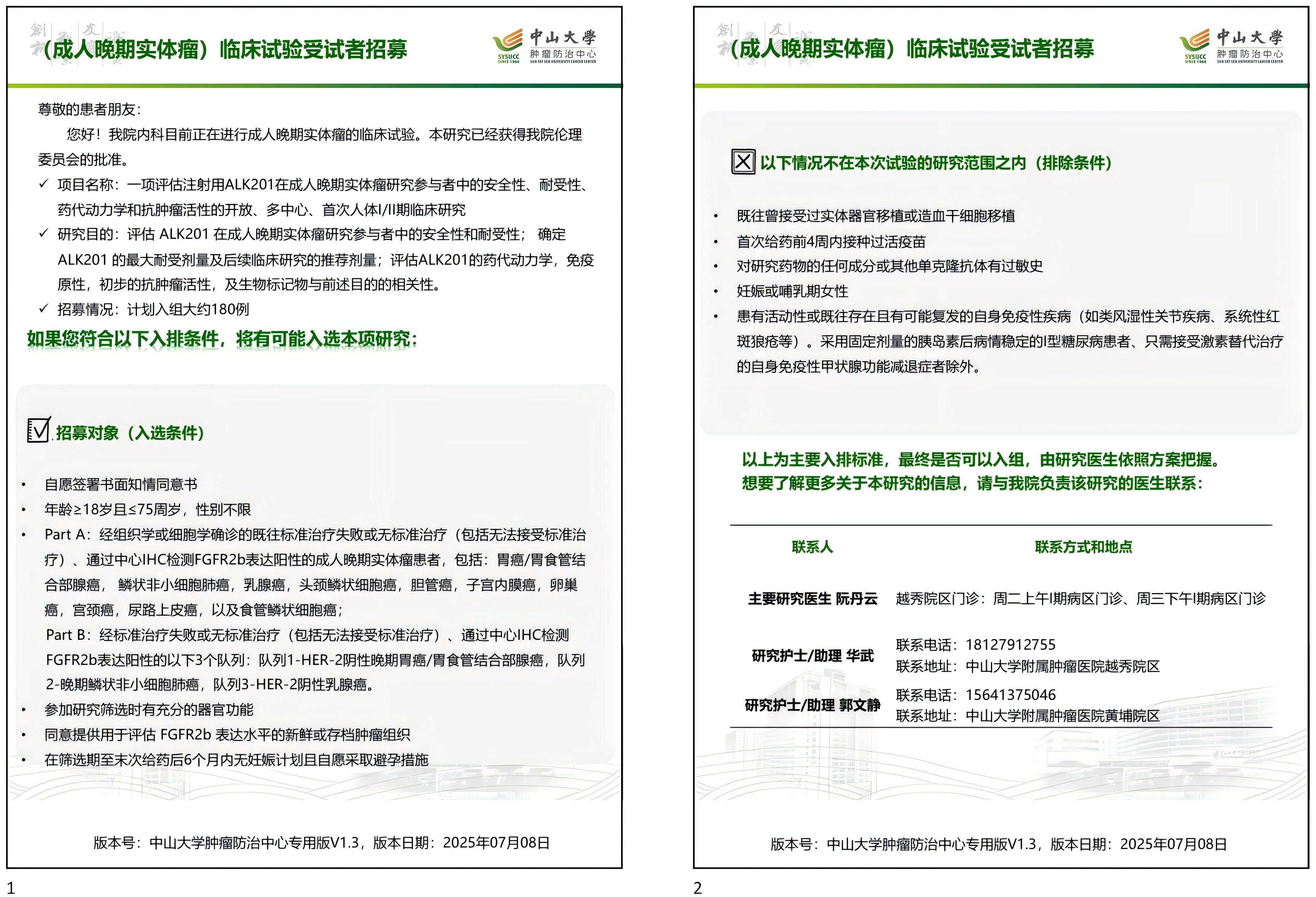 招募1. 一项评估注射用ALK201在成人晚期实体瘤研究参与者中的安全性、耐受性、药代动力学和抗肿瘤活性的开放、多中心、首次人体I/II期临床研究