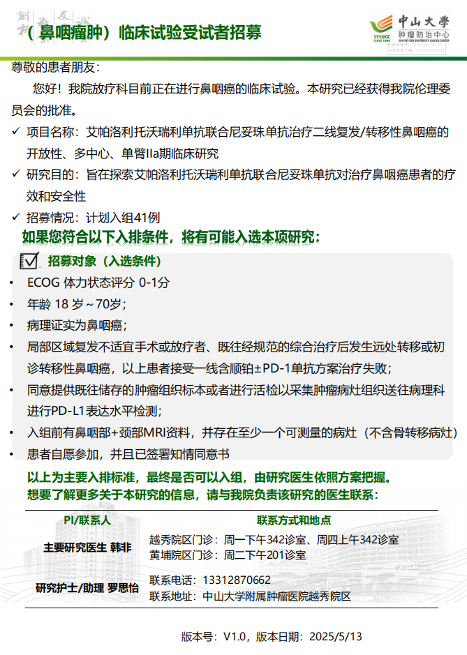 其他更多临床研究项目招募信息,请见https://recruit.sysucc.org.cn/recruit/home#/