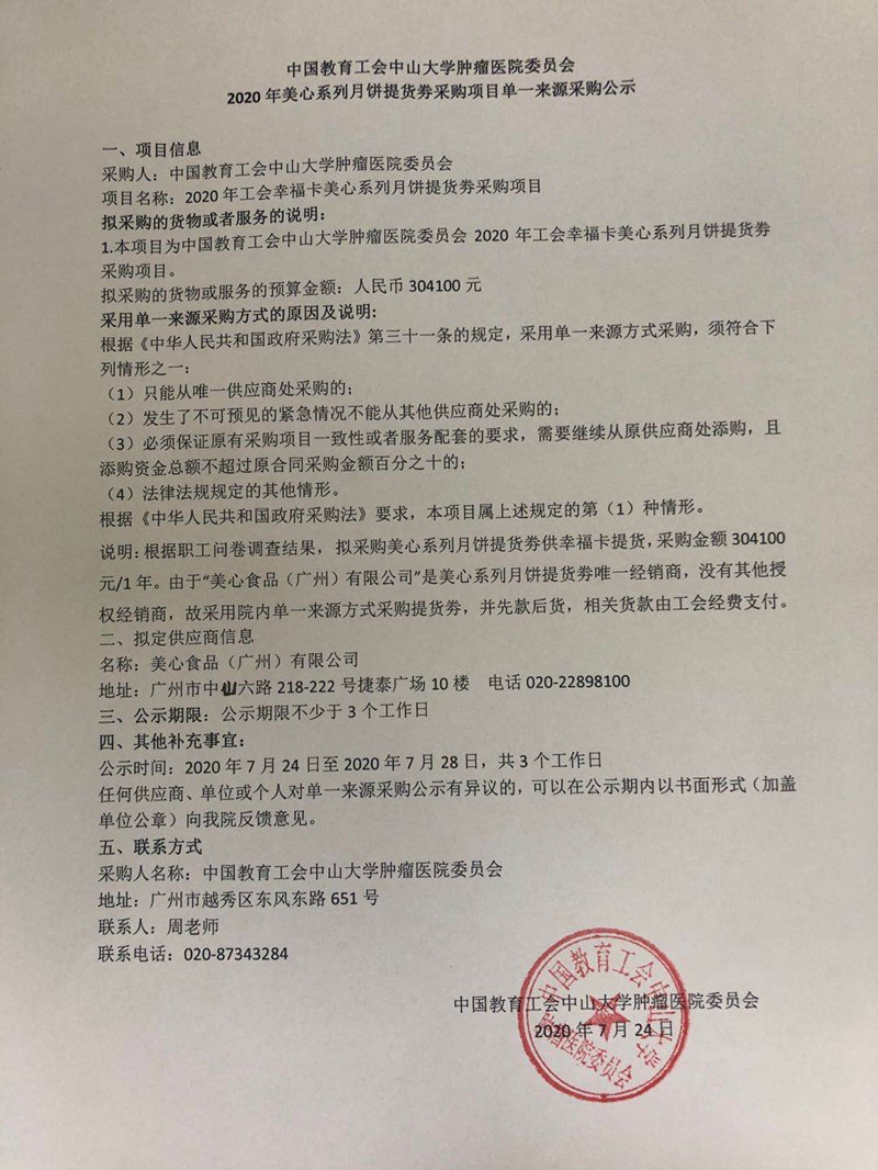 中国教育工会中山大学肿瘤医院委员会2020年美心系列月饼提货券采购项目单一来源采购公示