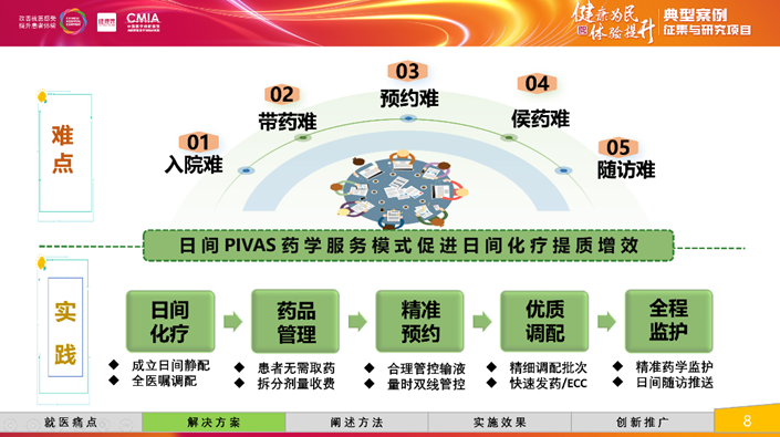 该案例聚焦肿瘤患者日间诊疗过程中的安全用药与高效运营,为肿瘤轻量化治疗的全流程药物管理提供解决方案。丘九望主管药师在案例分享时表示,中肿药学部团队以日间化疗中心为试点,依托一体化药房(日间化疗中心PIVAS),围绕肿瘤患者诊疗过程中的入院难、带药难、预约难、候药难、随访难五大痛点,推出五大举措,有效构建涵盖:日间PIVAS创建、药品管理、精准预约、优质调配、全程监护的全链条、全方位药学服务新范式,核心亮点包括: