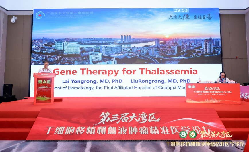 在浙江大学医学院附属第一医院金洁教授和山西医科大学血液病研究中心杨林花教授的共同主持下,广西医科大学第一附属医院赖永榕教授以《地中海贫血基因治疗进展》为题发表主旨演讲,介绍了广西医科大学第一附属医院在地中海贫血基因治疗领域的最新进展,技术涵盖慢病毒添加、CRISPR编辑及碱基编辑,其中碱基编辑(CS-101)成果发表于Nature,处于国际领跑地位。团队还成功治疗了首例东盟国家患者及国内镰状细胞病患者,标志着中国地贫基因治疗从“跟跑”迈向“并跑”和部分“领跑”。