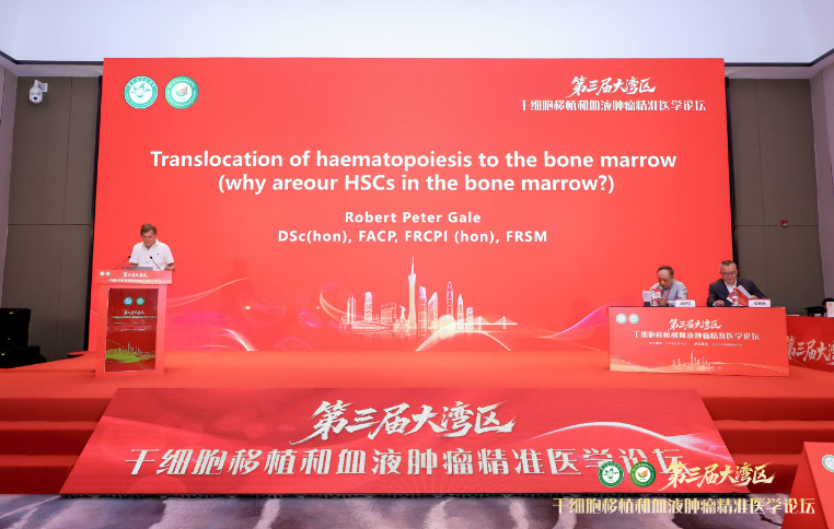 在解放军总医院胡亮钉教授和中国医学科学院血液病医院(中国医学科学院血液学研究所)邵英起教授的共同主持下,加州大学洛杉矶分校医学中心Robert Peter Gale教授以《Translocation of haematopoiesis to the bone marrow (why are our HSCs in the bone marrow?》为题发表主旨演讲,提出一个进化假说:造血干细胞定位于骨髓是对地球高辐射环境的适应。他从系统发育与个体发育角度阐述,随着生物从水生向陆生演化,失去了水对辐射的屏蔽,加上大气氧浓度升高加剧辐射损伤,骨骼作为辐射屏障为造血干细胞提供了庇护所,骨髓发育是应对高辐射及从水生向陆地过渡的进化结果,但无需过度担忧辐射问题。