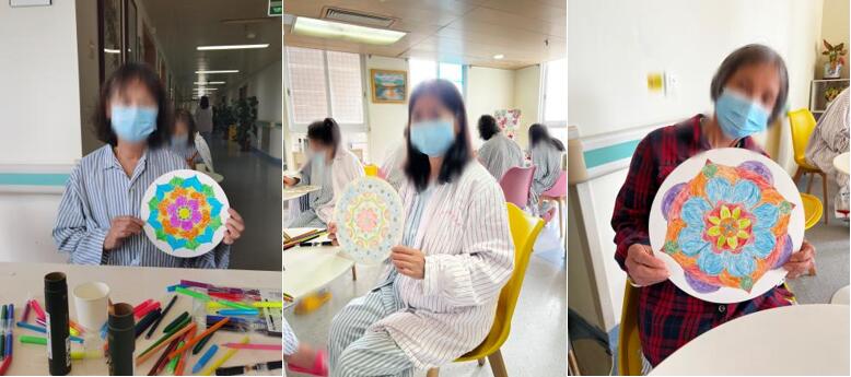 “黑色代表疾病,像莲花一样的圆轮,彩色一圈接着一圈,把疾病包裹、治愈,最后让黑色的中心消散......绿色代表希望,橙色代表阳光,阳光照耀着我,感觉温暖起来。”活动结束后,患者说,这样的小活动让自己暂时忘记了疾病的压力,在聚精会神的过程中,一定程度上对于我内心的压力起到了宣泄和缓解的作用。