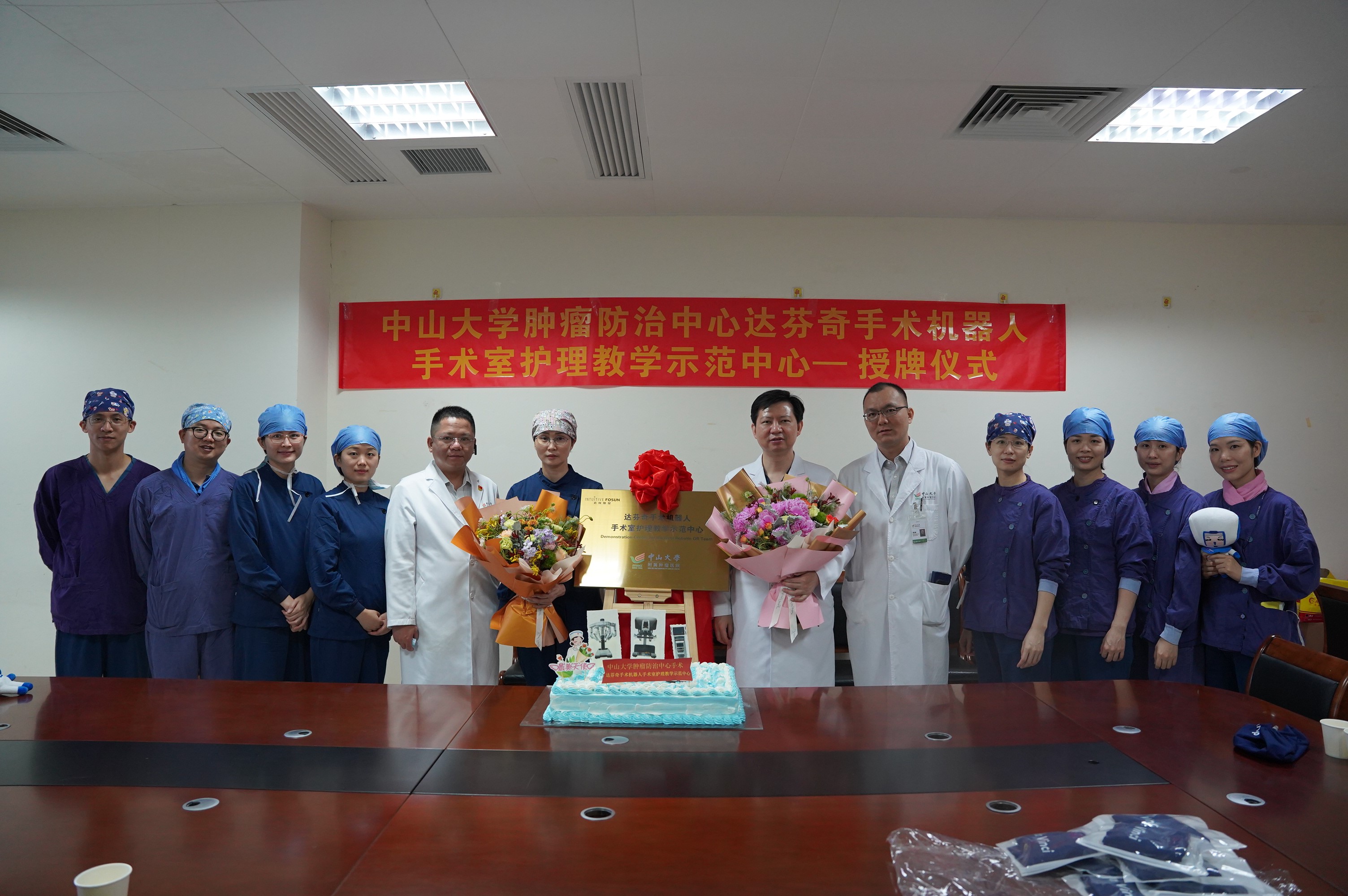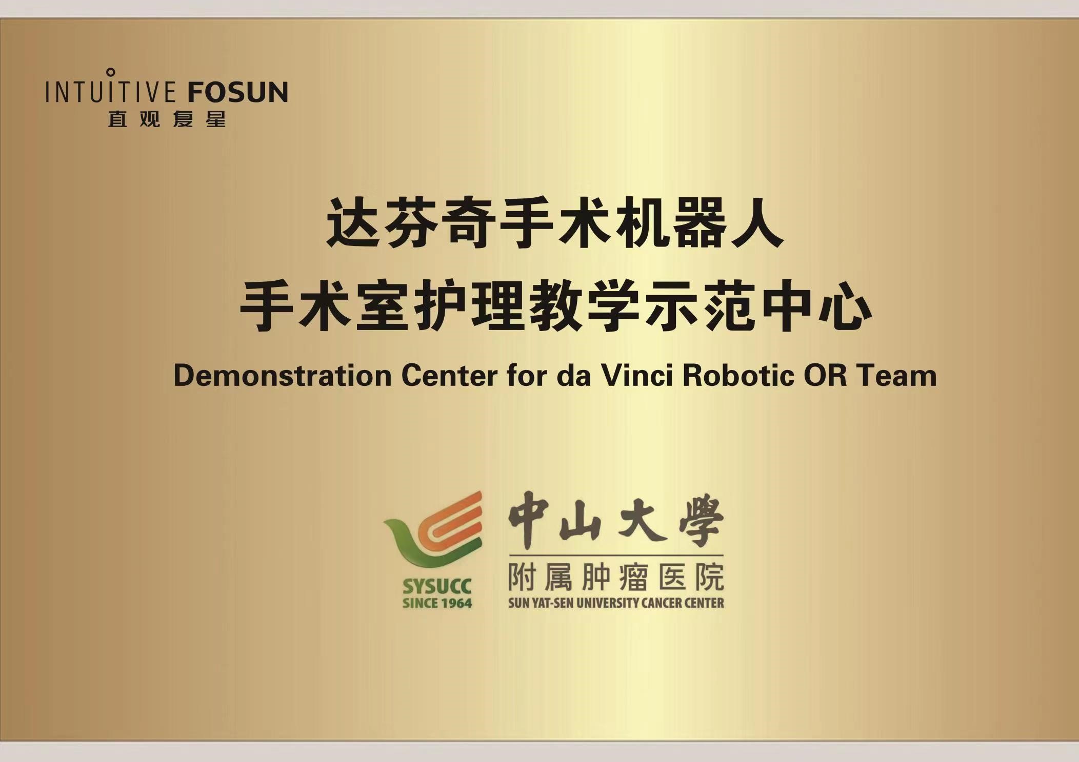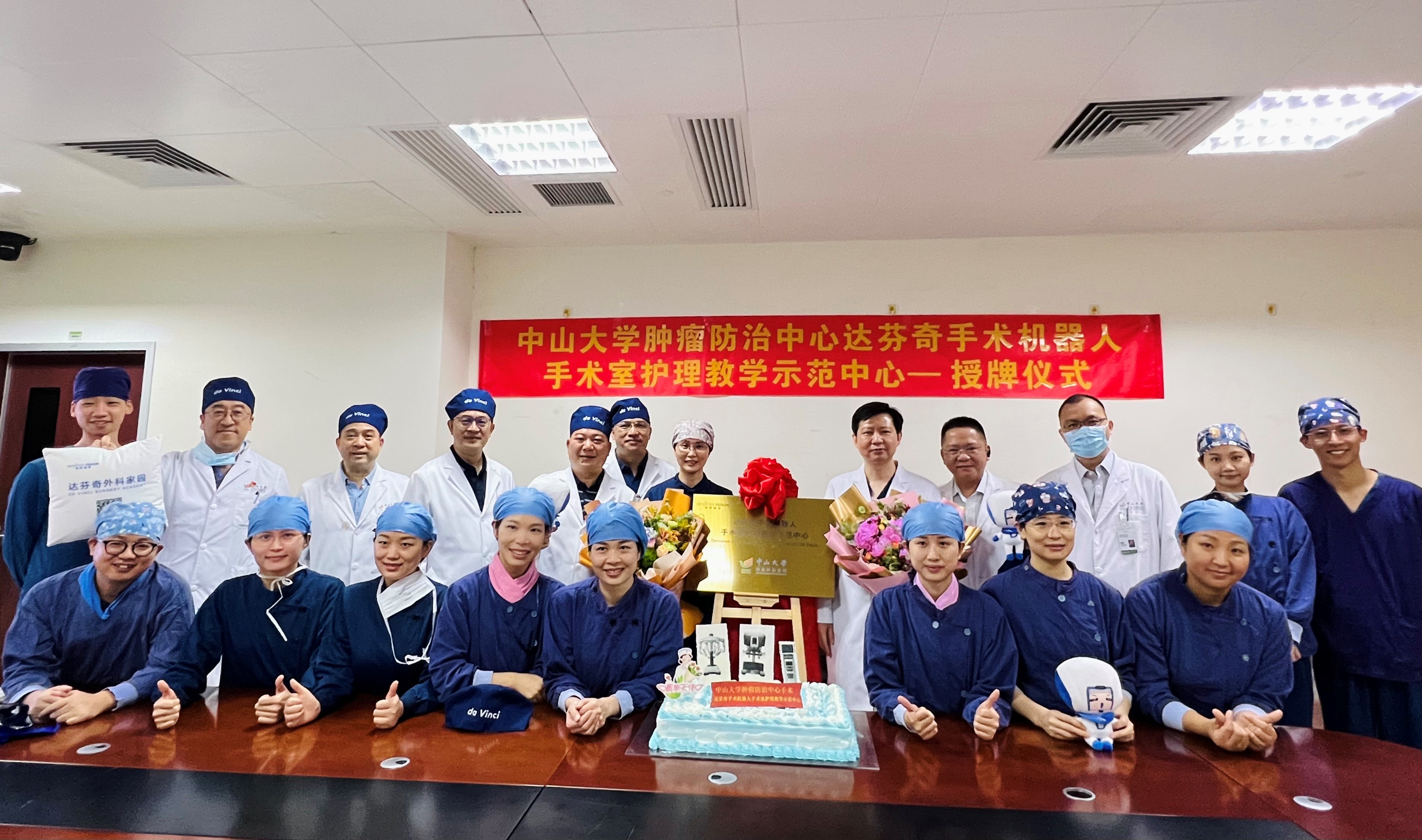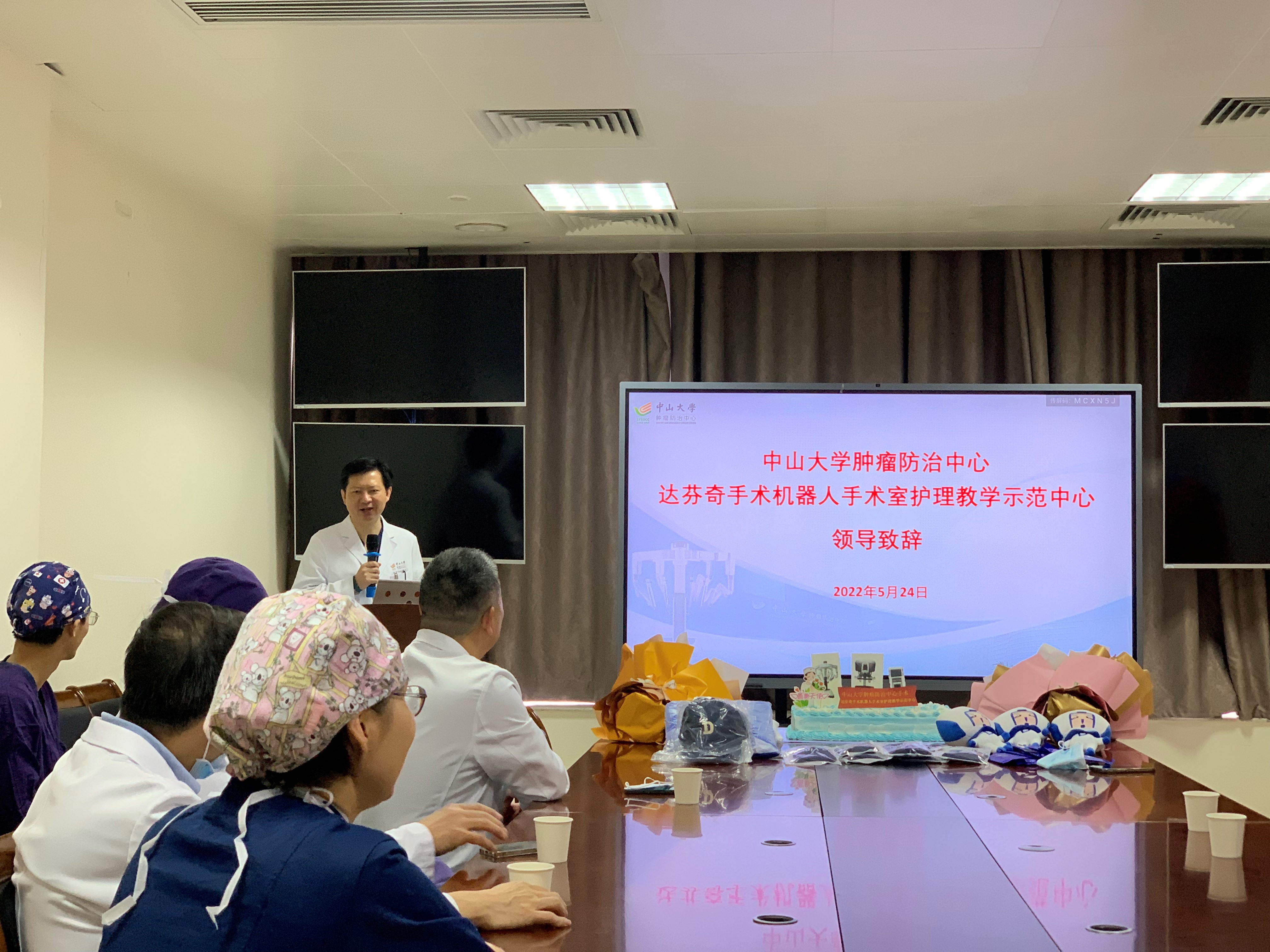 2022年5月15日,中山大学肿瘤防治中心达芬奇手术机器人手术室护理教学示范中心授牌仪式在手术室举行,刘卓炜副院长、医务处韦玮处长、相关外科主任以及手术麻醉科党支部李伟书记、刘艳玲护士长、机器人手术护理团队出席活动。