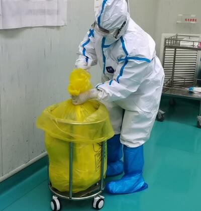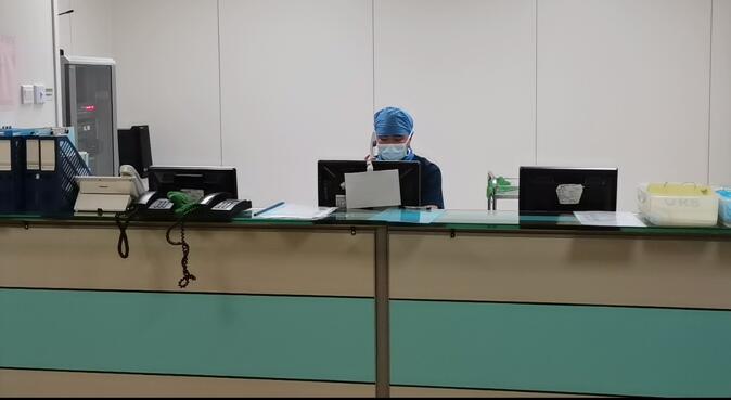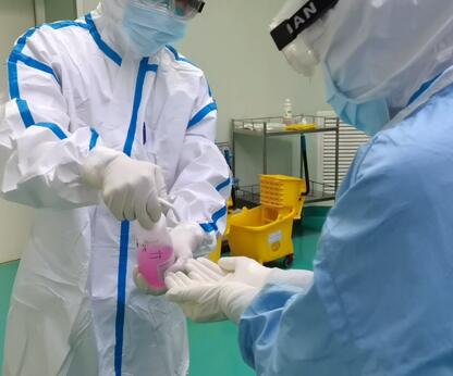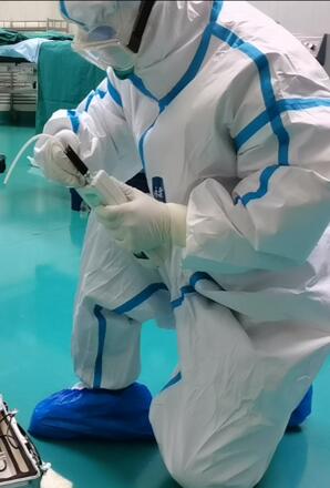 不同于普通手术,新冠患者手术需要在术前进行一系列复杂而繁琐的准备工作。手术相关人员的准备,科室相关场所的封闭管理,手术室间的负压管理,手术室间的布置,第一第二缓冲间的设置,相关防护物资的准备等都需要在极短的时间内完成。主班护士在接到电话后第一时间报备科主任和护长,通知手术相关人员即刻到位。严格而标准的术前准备是新冠患者手术顺利进行的前提和基础也是保护病人和医护人员的第一道防线。移走与此手术不相关的仪器设备和物品,对不易清洁的物体表面,如设备脚踏等,采用屏障保护,使用塑料薄膜等覆盖物,手术床铺单使用一次性防渗漏铺单……各种准备工作有条不紊地进行,十点三十分,准备工作全面完成,通知门诊送患者进入手术室。