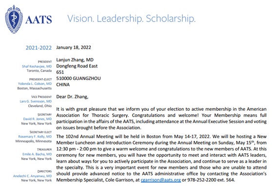 近日,中山大学肿瘤防治中心胸科张兰军教授顺利入选为美国胸外科协会委员(Active Membership of the American Association for Thoracic Surgery, AATS),并受邀于2022年5月14-17日第102届AATS年会期间,参加AATS新委员入会典礼。