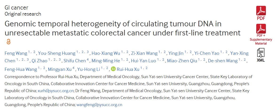 2021年9月6日,中山大学肿瘤防治中心徐瑞华教授团队在国际消化道权威期刊《肠道》(《Gut》)在线发表了题为《循环肿瘤DNA基因组在不可切除的转移性结直肠癌一线治疗过程中的时间异质性》的最新研究成果。中山大学肿瘤防治中心徐瑞华教授是通讯作者,王峰教授为共同通讯作者,王峰教授、黄酉生硕士、吴灏祥医师、王梓贤主治医师和金颖副主任医师为论文的共同第一作者。