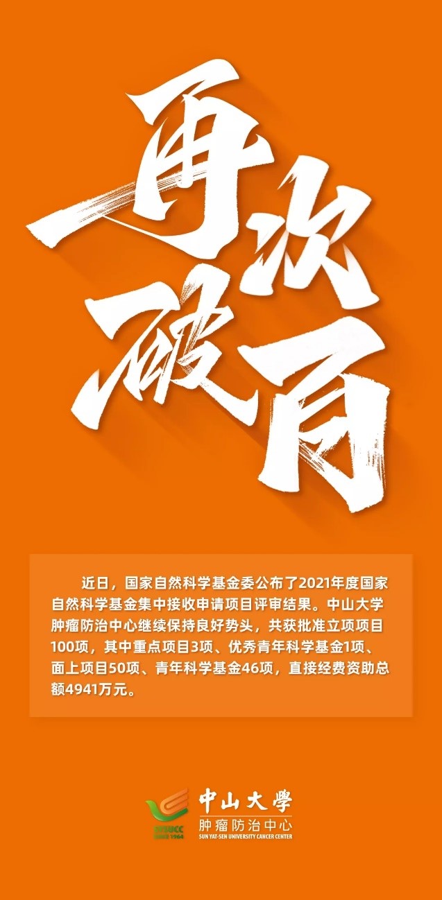 近日,国家自然科学基金委公布了2021年度国家自然科学基金集中接收申请项目评审结果。中山大学肿瘤防治中心继续保持良好势头,共获批准立项项目100项,其中重点项目3项、优秀青年科学基金1项、面上项目50项、青年科学基金46项,直接经费资助总额4941万元。