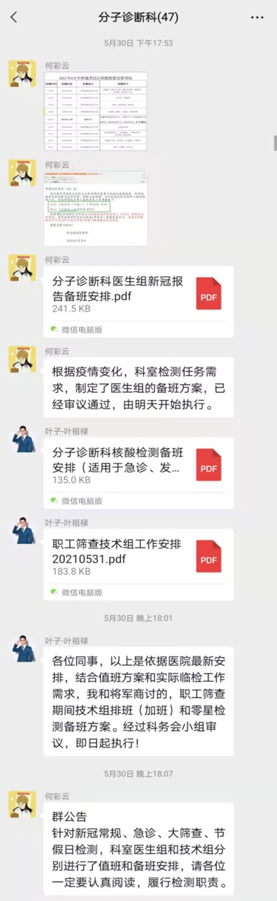 在职工筛查开始前的周末,新冠检测团队已于5月29日(周六)、5月30日(周日)连续加班2天,完成医疗辅助人员筛查。针对近期广州疫情的严峻形势,邵建永主任、科室秘书何彩云和支部委员叶祖禄等集体讨论决策,预见性地组织制定了夜间、节假日备班制度及排班表,保证越秀、黄埔两院区7×24小时应急检测不中断。不论检测团队还是检测仪器,每天都在高强度、满负荷运行,但每想到这是真真正正在为群众办实事,确确实实为医院解难题、为抗疫做贡献,大家虽然疲惫但没有抱怨,遇到了困难但绝不退缩!