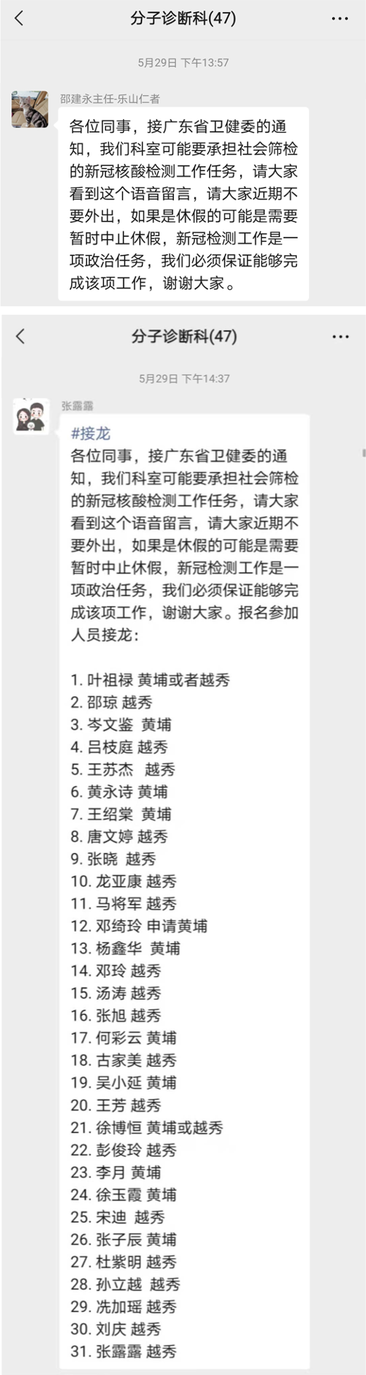5月29日下午分子诊断科接到广东卫健委通知,可能将承担社会筛检任务,全体员工立即在工作群里踊跃报名,14:37完成全员集结!其中党员14名,入党积极分子2名。大家都想为医院、为社区、为这座亲爱的城市贡献一点点光和热。作为幕后检测人员,他们在自己的岗位上为防疫工作拼尽全力,虽然工作在幕后,其实战斗在一线!