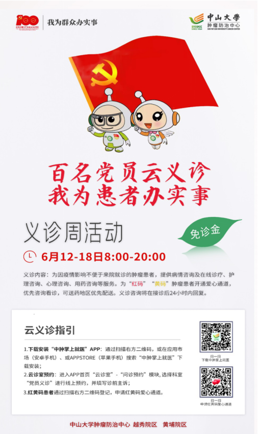 为了解决当前疫情防控形势下肿瘤患者就医需求,特别是为因健康码为“红码”“黄码”、暂不能现场就医的患者提供便捷诊疗服务,中肿各级党组织、党员围绕党史学习教育“我为群众办实事”实践活动要求,将于2021年6月12——18日开展“百名党员云义诊,我为患者办实事”义诊周活动。300位专家坐诊“云端”免诊金提供在线诊疗,复诊肿瘤患者还能享受抗肿瘤药物快递到家服务!