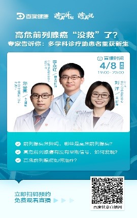 4月8日晚,泌尿外科李永红教授带领MDT团队,在百度健康进行直播,主要针对“哪些是高危前列腺癌”“高危前列腺癌的早期信号”“高危前列腺癌如何治疗”等问题进行答疑和宣讲,共有49874人次观看和回看。