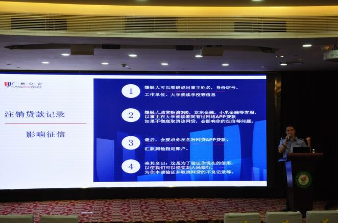黄所长从“什么是电信网络诈骗、电信网络诈骗发案现状、电信网络诈骗的常见形式以及如何开展反诈防诈工作”等方面,通过揭秘诈骗手法、分析识别要点、播放反诈视频案例,对冒充公检法、杀猪盘、网络刷单、购物退税退款、注销校园贷等常见诈骗案例进行深入浅出的讲解,并向大家科普了国家公安反诈中心电话,再次介绍了“穗安防诈”公众号,全方位对网络诈骗进行了深入浅出的解读。