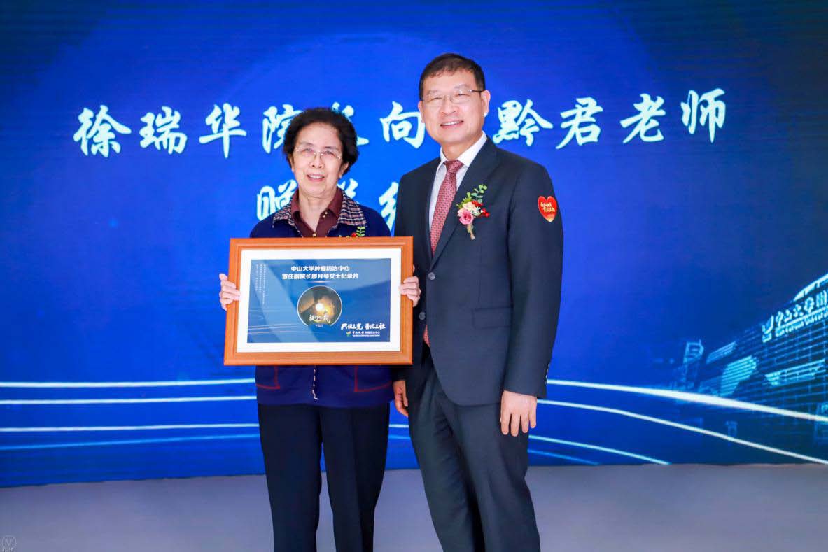 徐瑞华院长向首任副院长廖月琴女士的家属——钟南山院士特别代表钟黔君女士赠送首任副院长廖月琴女士纪录片《提灯四十载》。钟黔君女士深情地回忆了母亲克服重重困难、全身心投入筹备华南肿瘤医院的工作情形,对中山大学肿瘤防治中心铭记创院先辈、并专门拍摄纪录片表示衷心的感谢,钟黔君女士祝愿中山大学肿瘤防治中心越办越好,造福广大民众。