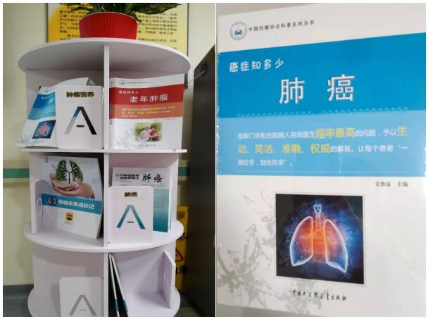 除了线上向公众科普,在线下科普防治中,中山大学肿瘤防治中心胸科同样关注肺癌患者及其家属的就诊疑虑。前期,收集了肺癌患者及家属最关注的热点问题,针对他们关心的问题有计划地选购相关书籍,并于科室内设置读书角,供入院患者阅读学习。书籍种类涵盖肿瘤基本知识、肺癌科普、肺癌护理、肿瘤营养、老年肿瘤以及肿瘤患者的抗癌经历等各个方面。同时,针对肺癌防治的进展和患者当下关注的热点话题,收集并选取相关专家的科普视频于科室内每天循环播放,提高患者及家属在肺癌预防、治疗、康复方面的知识。近期,越来越多的患者询问免疫治疗方面的问题,胸科选取了肺癌中免疫治疗进展的相关内容进行播放,让患者对于免疫治疗的概念和适用范围有了一个初步的认识。