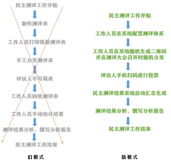 往年,中心的民主测评工作采用纸质化方式,测评表印制、分类、发放、回收、过程监控、结果统计等都是通过手工完成,且评价过程中无法实时了解进度,而考核涉及员工切身利益,对准确性要求很高,为了避免错漏往往需要多人验票、统票、复核,步骤繁琐,费事费力,效率低下。