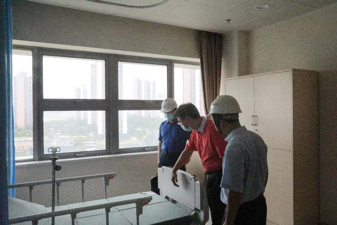 在黄埔院区,武少新书记、彭望清副院长一行从十一层病房开始,依次调研了各临床病区、业务科室平台、大堂与门急诊空间,一直走访调研至赴一层放疗治疗室。走访过程中,尽管汗水早已湿透了衣服,但中心领导一行逐一走访调研,把每一个模块的建设进展摸透,落实关键节点。