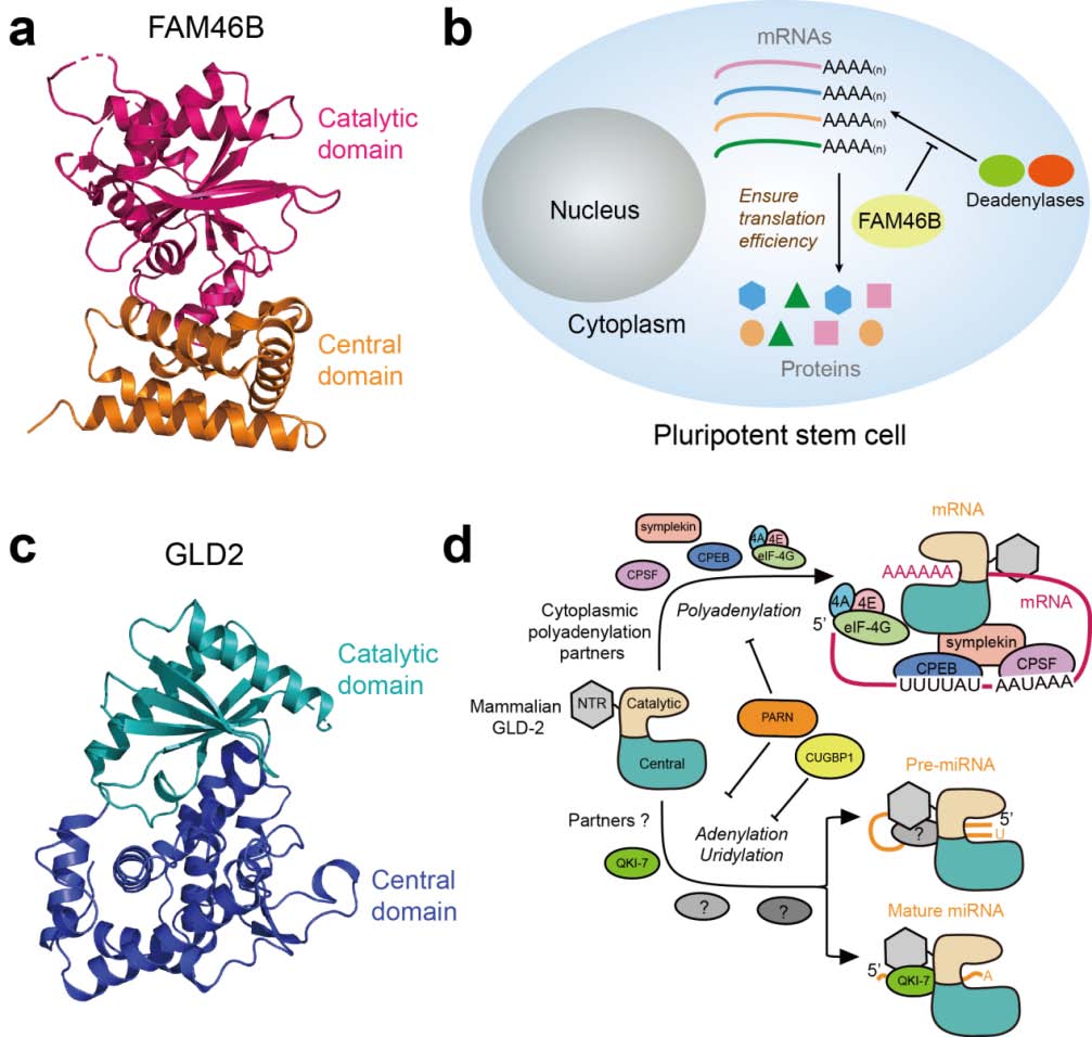 图:a和b为人的FAM46B蛋白的结构和在多能干细胞中发挥功能的模式图;c和d为大鼠的GLD-2的蛋白结构和在哺乳动物中通过不同的分子机制参与对各种RNA进行转录后3’末端加工过程的模式图。