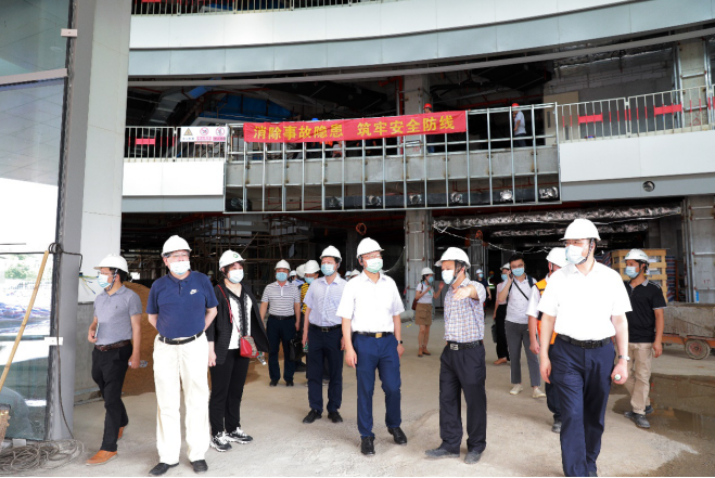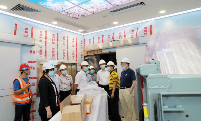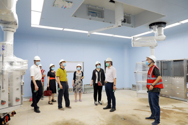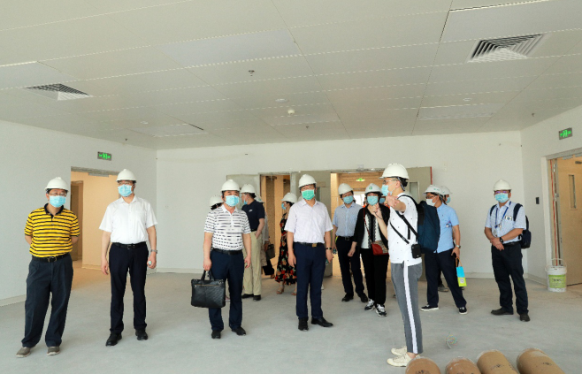 调研组实地调研了医院大堂、影像中心、标准病房、骨髓移植病房、重症监护病房、核医学科、放疗中心、动物实验中心、信息机房、行政办公和门急诊空间,无惧施工现场的湿热环境,足迹踏遍了项目的各个功能区域,充分了解各部分工程施工情况与完工计划。