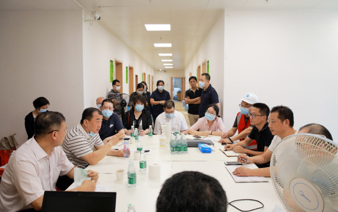 现场视察结束后,调研组立即在现场临时搭建的会议室听取了新院区建设办公室的工作汇报,对现场施工面临的各项困难进行了讨论,并当场作出工作安排。武少新书记提出在疫情防控新常态下,既要充分分析疫情,也要扎实推进工程进度。徐瑞华院长指出,2020年中心工作的重中之重是黄埔院区开业,他同时要求各参建单位将人民大众的生命健康放在首要位置,重视黄埔院区项目民生工程的定位,将更多力量聚焦在此项目,攻坚克难,早日实现项目完工。