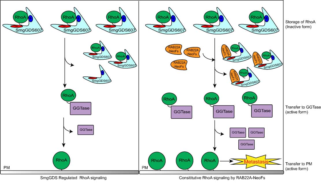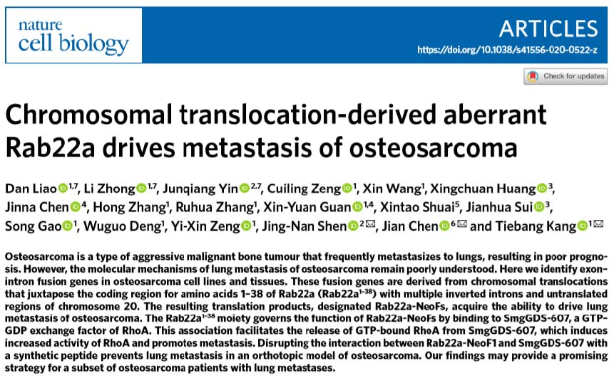 中山大学肿瘤防治中心康铁邦教授、中山大学附一院沈靖南教授、苏州大学陈坚教授等研究团队合作,在骨肉瘤细胞系和肿瘤组织中,发现了几个与RAB22A1-38相关的融合基因,其融合蛋白(Rab22a-NeoFs)可结合SmgGDS607,促进RhoA的活化,从而促进骨肉瘤的肺转移,并合成了特异靶向的穿模多肽,可阻断该融合蛋白的功能,为骨肉瘤肺转移的靶向治疗提供了一个新的潜在靶标。同时,这类RAB22A1-38相关的融合基因在乳腺癌、肺癌的细胞系和/或肿瘤组织中也存在,并促进肿瘤转移,拓展了该治疗靶标的临床意义。研究成果于2020年6月1日,以Article形式在线发表于国际著名学术期刊《自然细胞生物学》(Nature Cell Biology),期刊最新影响因子为20.761。