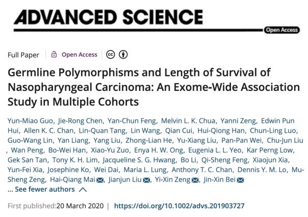 该原创性研究成果于3月20日在线刊登于国际知名期刊《Advanced Science》,题目为“遗传变异与鼻咽癌生存期:多队列的外显子组水平关联分析”。中山大学肿瘤防治中心郭允苗(博士后)、陈杰荣(博士生)、冯燕纯(博士生),新加坡国立癌症中心Melvin Chua博士,中山大学中山医学院曾燕妮博士为共同第一作者;中山大学肿瘤防治中心贝锦新研究员、曾益新院士、麦海强教授和新加坡基因组研究所刘建军教授为论文共同通讯作者。