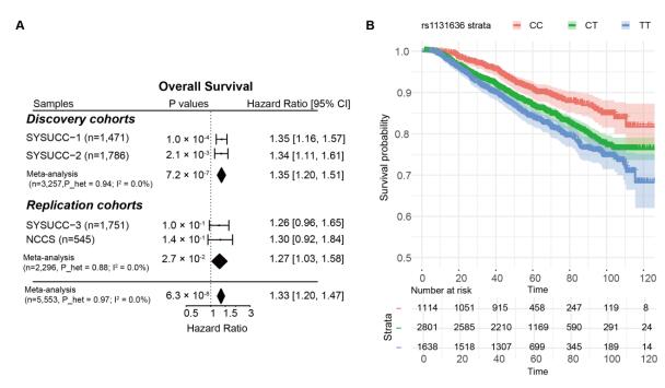 图1 遗传变异位点rs1131636与鼻咽癌患者总生存时长显著关联