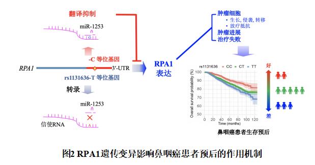 功能学研究发现,位于RPA1基因3′-UTR区域的rs1131636位点对RPA1基因的表达起重要的调控作用。体外细胞模型实验结果表明,RPA1表达上调能够促进鼻咽癌细胞的增殖、侵袭和转移并且提高其对放疗的抵抗性;动物实验结果也证实了RPA1表达上调能够提高鼻咽癌细胞在小鼠体内的成瘤能力;在复发患者肿瘤中,RPA1表达水平显著增加,提示RPA1在鼻咽癌的进展过程中发挥着重要的作用。进一步研究发现,该rs1131636位点等位基因C提高与miR-1253结合能力,抑制其上游基因RPA1的正常翻译,降低RPA1蛋白水平。这些结果提示,相比于rs1131636-CT和-TT基因型,携带-CC基因型患者肿瘤在miR-1253作用下,RPA1表达水平下降,放射射线敏感性提高,肿瘤恶性程度降低,预后情况良好。