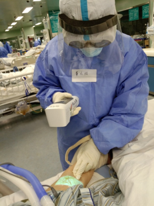 中肿重症医学科黄小玲护师讲到,中肿医疗队现在用静脉显像仪来穿刺、抽血、输液,更加安全、高效。小玲讲到,早在2月4日,中华护理学会在《新型冠状病毒感染的肺炎患者-医务人员静脉输液治疗工作建议》中就提出护理人员由于面罩、防护服、眼罩、手套等防护用具的使用,静脉穿刺时手触摸静脉的敏感度下降,建议使用“血管可视化技术”。
