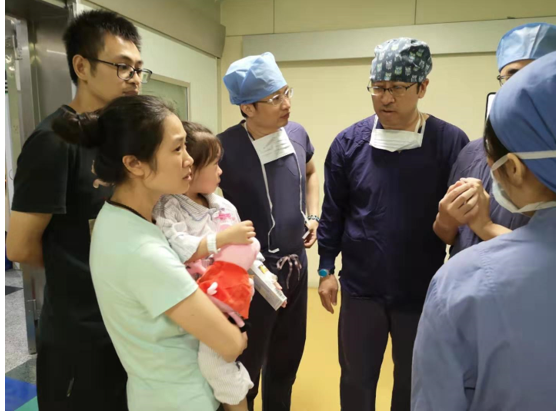 小姑娘这句话传到了鼻咽科副主任陈明远教授的耳朵里,陈教授马上掏钱给护士姑娘买了好几个佩奇玩偶,送到绒绒的病床前。手术前,鼻咽科党支部书记麦海强、科主任郭翔教授,还有主刀医生陈明远教授全面细致地评估了绒绒的病情,经过几次会诊,给绒绒确定了个体化治疗的方案,因为鼻咽肿瘤在头部,诊疗方案除了考虑疗效外,几位教授还更多地考虑绒绒以后的生活质量,以求最大限度保护幼童脑部器官。
