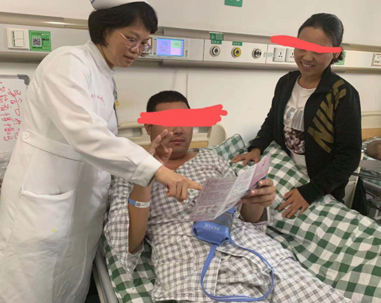 为了给这对不寻常的有障碍夫妇更多的关爱,鼻咽科的护理团队还利用休息时间对阿明进行了一对一的科普宣教,确保阿明知道治疗过程中的注意事项。悉心的照料,让住院中的阿明夫妇脸上总有温馨的笑容。