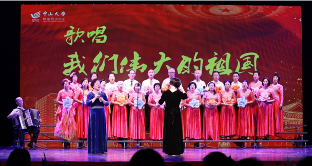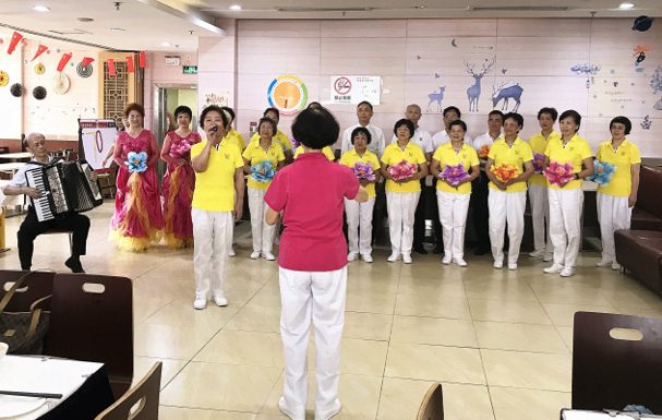 最后,中心离退休老干的“阳光合唱团”队员们表演了《我爱你中国》和《我们的生活充满阳光》,把现场气氛推向高潮。