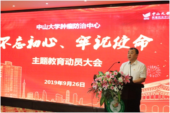 9月26日下午,中山大学肿瘤防治中心举行“不忘初心、牢记使命”主题教育动员大会。中心党委武少新书记作动员讲话,巡回指导一组组长、中山大学政策研究室主任夏亮辉作指导讲话,巡回指导一组副组长赵婉文及成员李永乐、蔡炽聪,肿瘤防治中心领导班子成员,中心党委委员、纪委委员,各处、科室正副职负责人、护长,党支部书记、支部委员,团委委员及职工党员代表等210余人出席了本次大会。会议由中心党委副书记、纪委书记何韵同志主持。