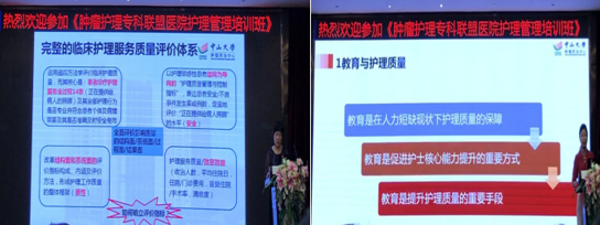 覃惠英主任对“发展护士角色,拓宽护理领域,促进护理专业与国际接轨”进行了深刻的剖析,专科护士的培养辛明珠护理部主任以我院专科队伍建设为例,围绕“肿瘤高水平专业护理人才的培养”这一临床护理工作者非常关注的话题进行主题分享。她深入浅出地介绍了我院专科护士规范化、系统化的培养构建体系,引发现场每一位听众对培养更多专家型、技术型护士的管理理念深层次的思考,真正大力推动着肿瘤护理人才的发展。