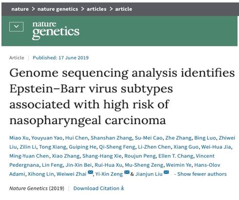 近日,中心曾益新院士团队与合作伙伴共同努力,在EB病毒致癌研究领域取得了重要进展:通过对来自鼻咽癌高发及低发区的EB病毒进行全测序分析,发现了与鼻咽癌有关的高致病性EB病毒亚型。该高危亚型是迄今为止发现的与鼻咽癌发生相关的最大风险因素,对于研发鼻咽癌预防性疫苗及开展高危人群的早期筛查具有重要意义。该研究以题为“全基因组测序鉴定鼻咽癌相关的EB病毒高危亚型”于2019年6月17日以论文形式在顶级学术期刊《自然·遗传》(Nature Genetics)(近五年影响因子IF:31.1)发表。