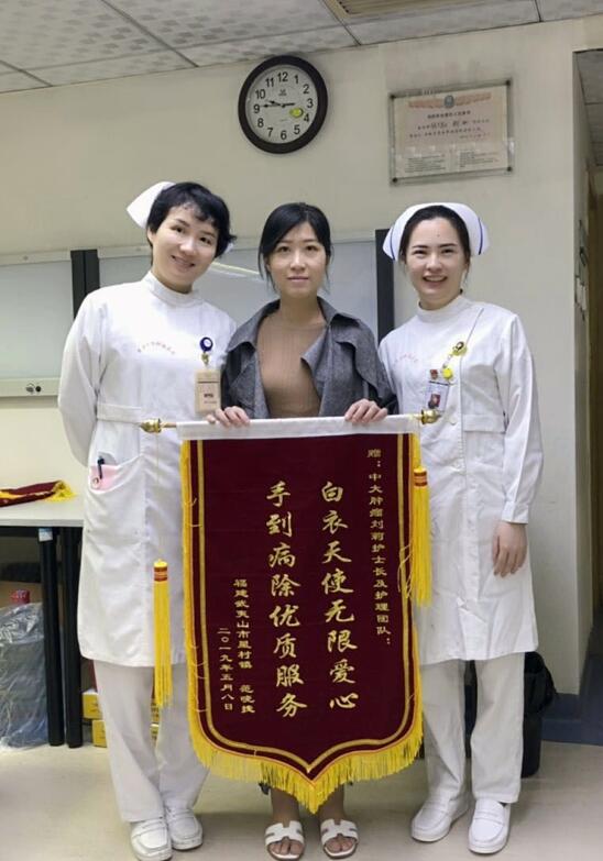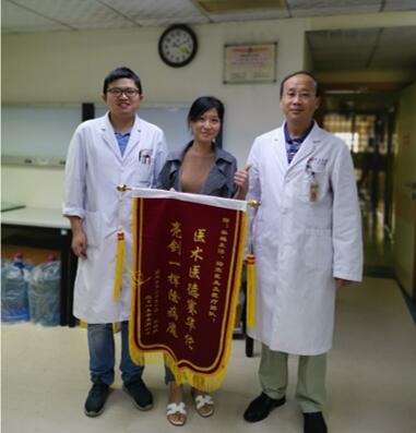 在林鹏主任以及刘莉护长医护党员团队的精心合作下,范小姐术后恢复很快,治疗效果非常理想,于术后第六天顺利出院,范小姐以及家属非常开心,感激医护人员对其进行生命的救治。在五月八日,范小姐第一次返院复查,她向为她全力施治和悉心护理的林鹏主任、杨寒医生和刘莉护长团队赠送了锦旗,用“医术医德赛华佗,亮剑一挥除病魔”和“白衣天使无限爱心,手到病除优质服务”来表达她以及她的家人对林鹏主任团队的感谢之情。