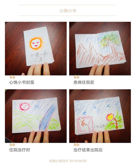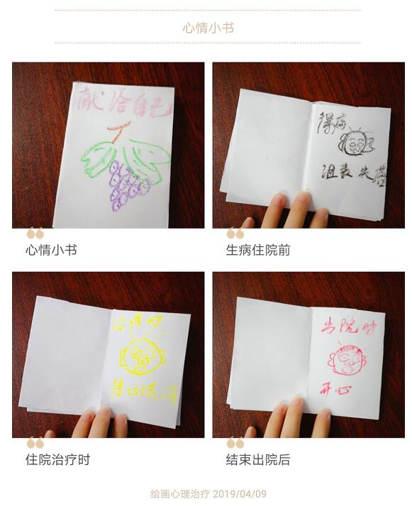参与绘画的患者或家属在护理人员的指导下制作属于自己的“心情小书”。小书分三页,参与者需分别画出患病住院前、住院治疗时及治疗结束出院后的心情。
